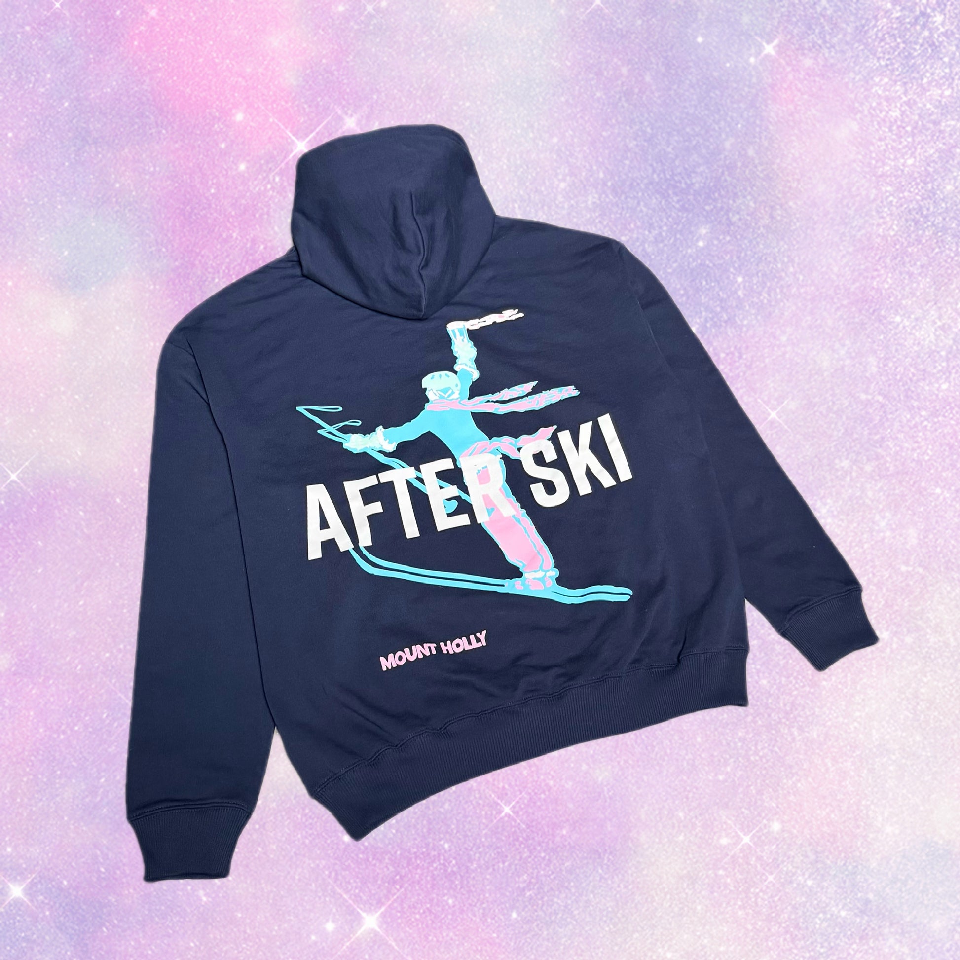 100% organic cotton hoodie in French Navy. Mount Holly branded proudly on the front. On the back, our After Ski logo paired with a modern block print. Four color screen print applied individually by hand. Soft as a well-behaved golden retriever, sturdy enough for parking-lot tailgates.