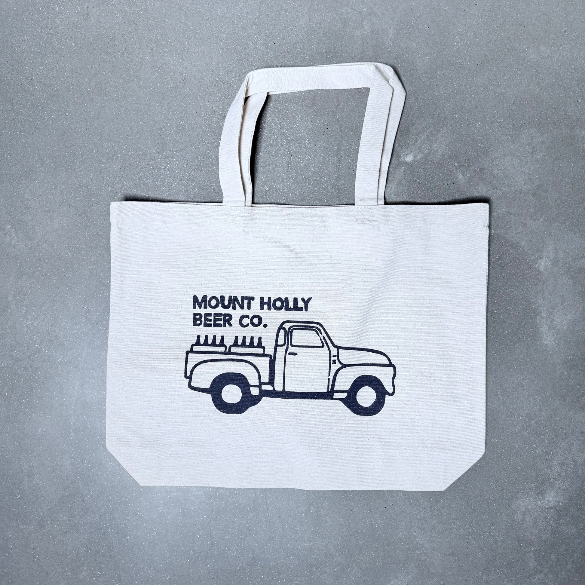 Canvas tote bag screen printed with a classic Mount Holly truck and stamp logo.